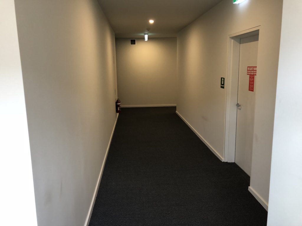 Walk down the footpath to the 1st glass door on the right hand side.