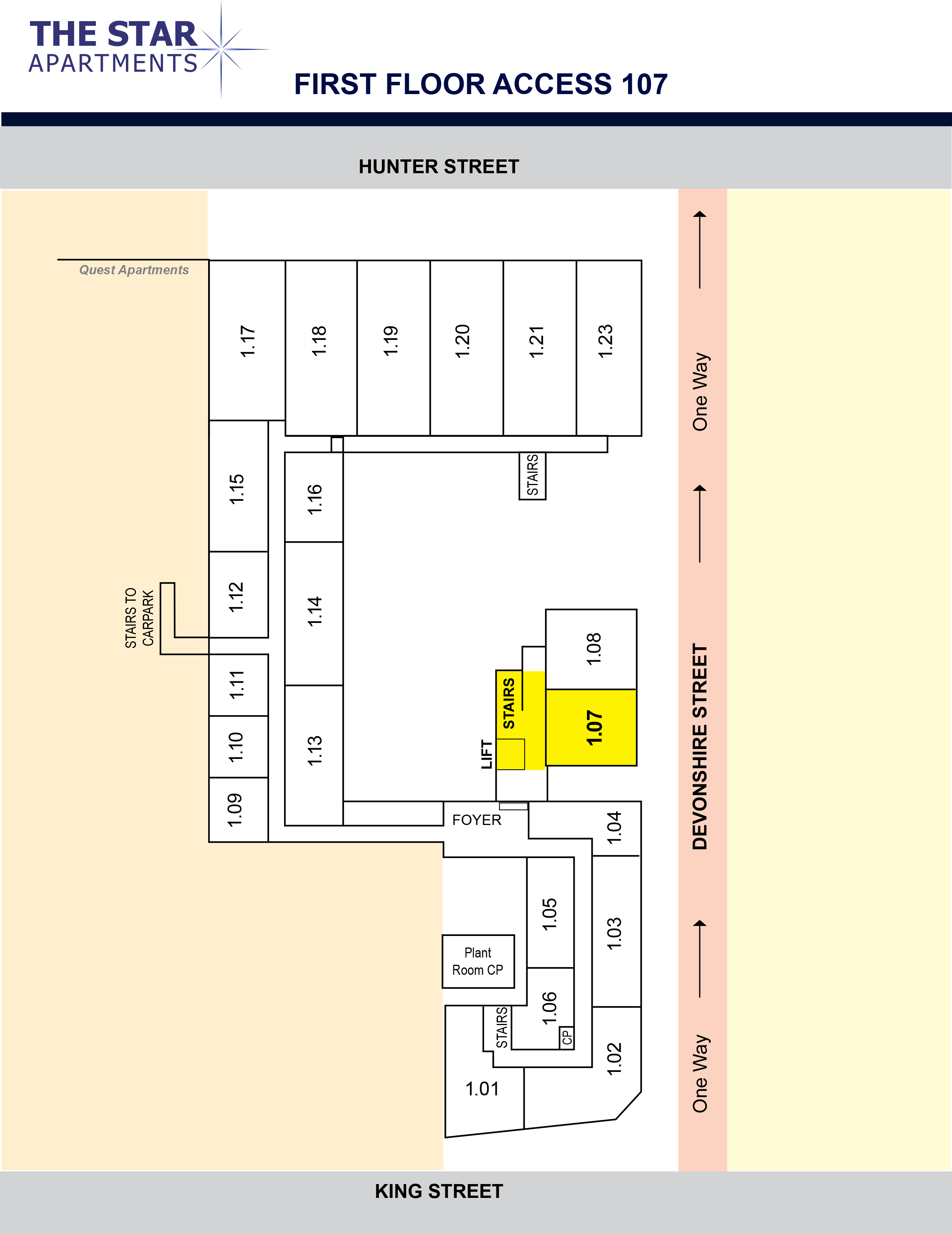 Devonshire Street is one way from King Street to Hunter Street. The King Street entrance of Devonshire Street is often blocked with tables and chairs from the Star Hotel and is often only accessible on foot. Enter your pin code received via sms into the side gate in Devonshire Street then you are able to walk to your apartment. See alternate car parking options.