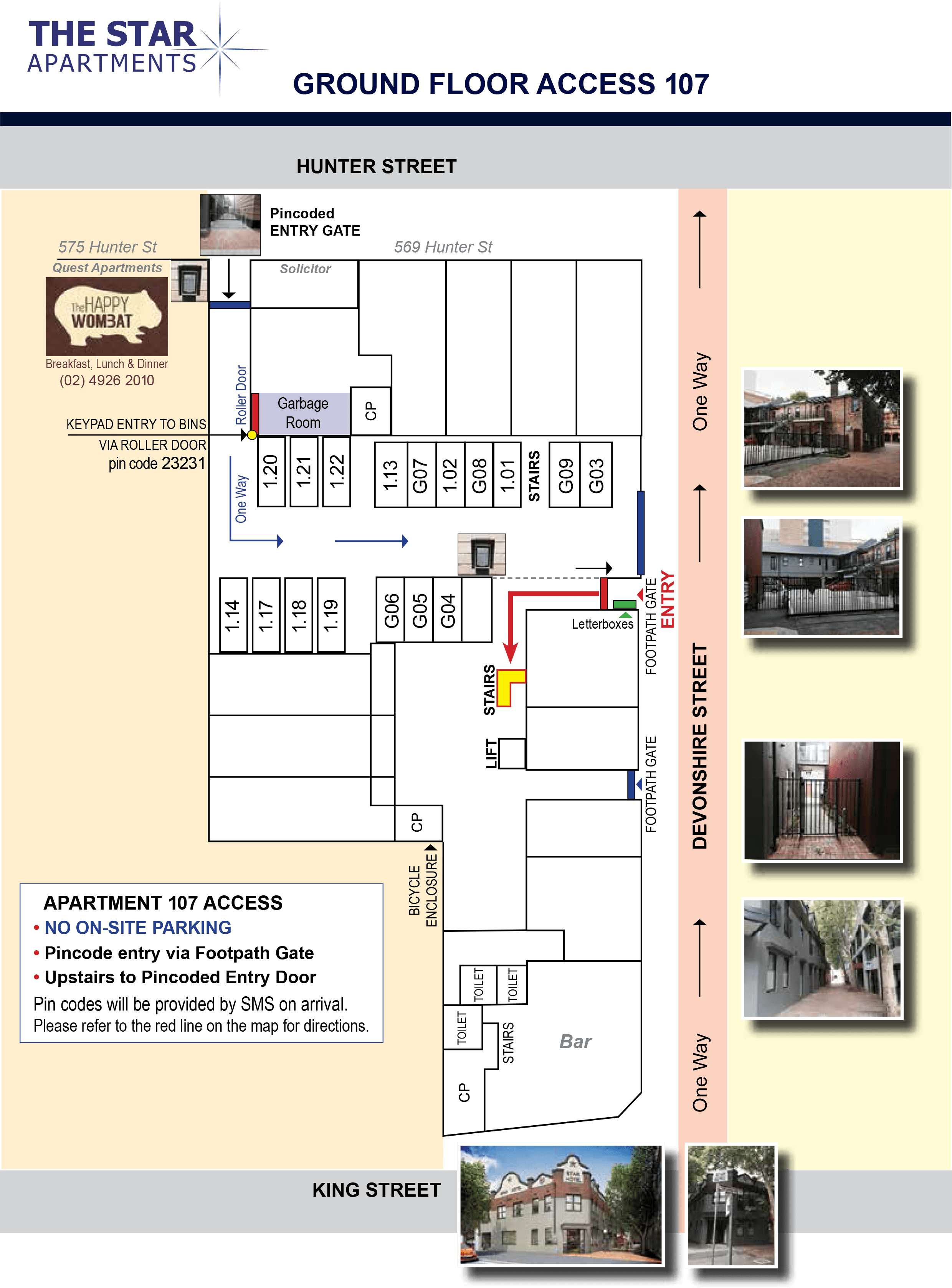 Drive down the entrance of the car park in Hunter Street, between the Happy Wombat and Star Apartments. Enter pin code for car park area sent via sms on the day of arrival. Exit via Devonshire Street only. Detailed access instructions.