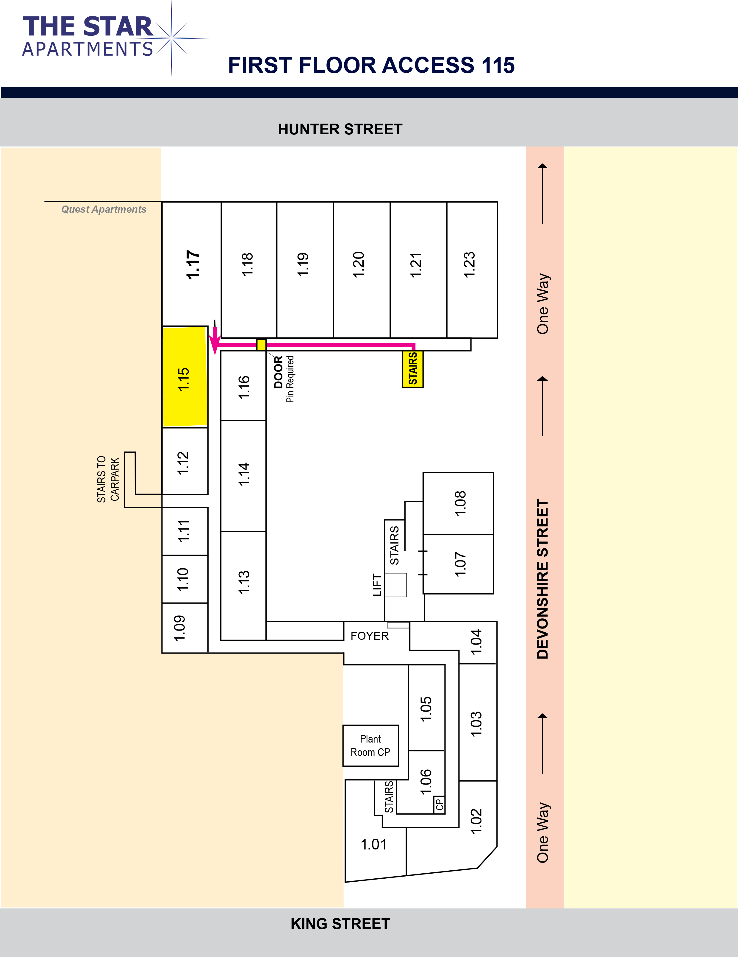 Devonshire Street is one way from King Street to Hunter Street. The King Street entrance of Devonshire Street is often blocked with tables and chairs from the Star Hotel and is often only accessible on foot. Enter your pin code received via sms into the side gate in Devonshire Street then you are able to walk to your apartment. See alternate car parking options.