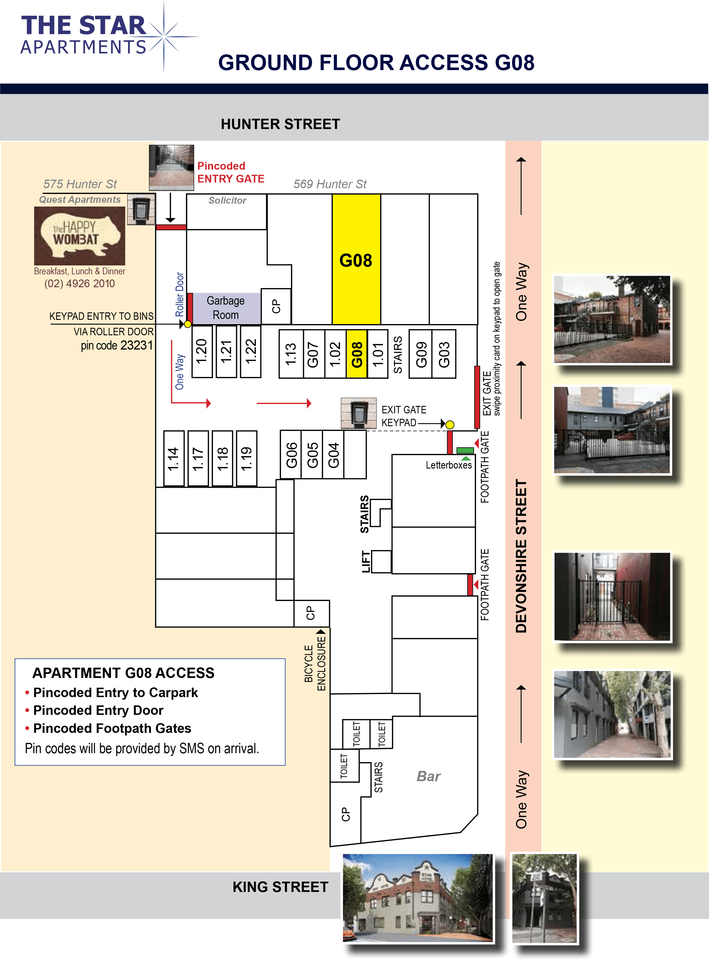 Devonshire Street is one way from King Street to Hunter Street. The King Street entrance of Devonshire Street is often blocked with tables and chairs from the Star Hotel and is often only accessible on foot. Enter your pin code received via sms into the side gate in Devonshire Street then you are able to walk to your apartment. See alternate car parking options.